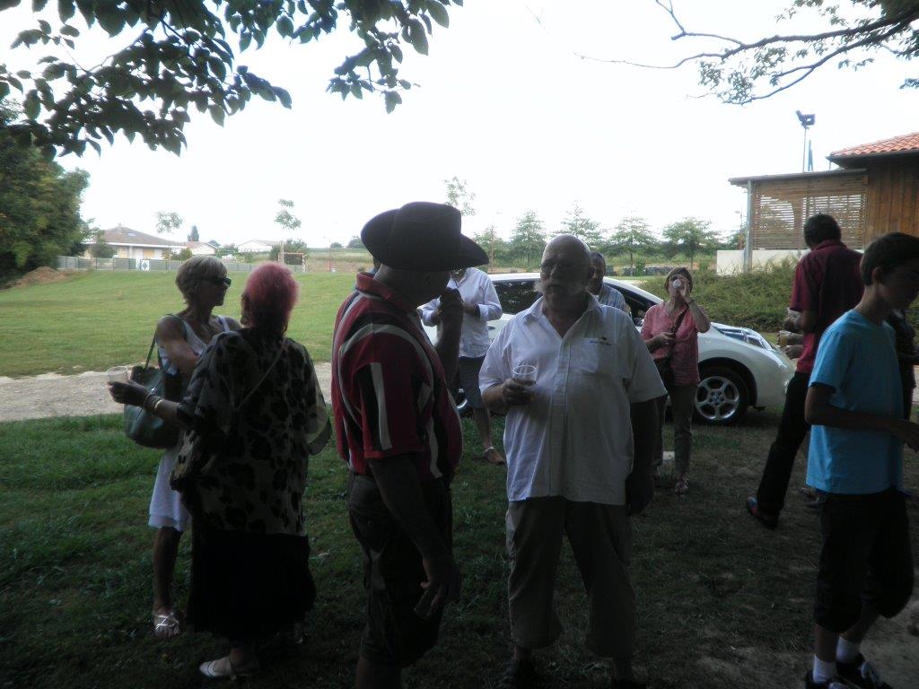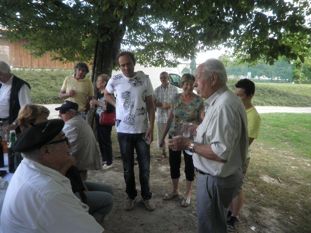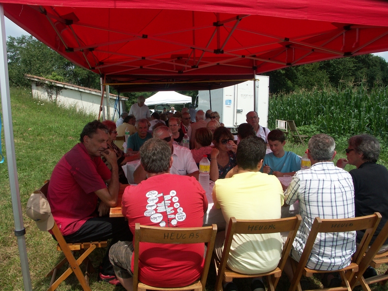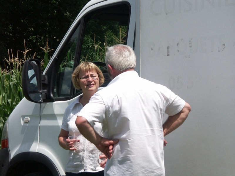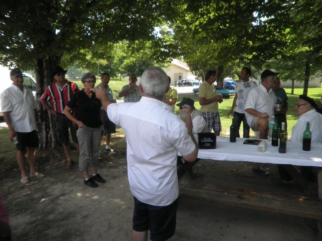 Nous avons atteint Heugas à l’allure d’un sénateur, avec des pointes à 40 km/h. Là Hélène nous avait préparé avec amour, une tonne d’amuse gueule pour faire passer l’appéritif, dans un joli parc. M. le Maire nous a fait l’honneur de sa visite en voiture électrique.