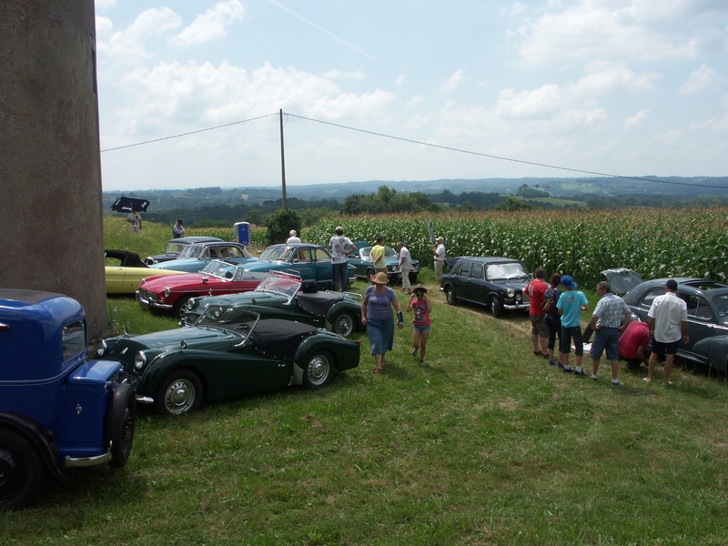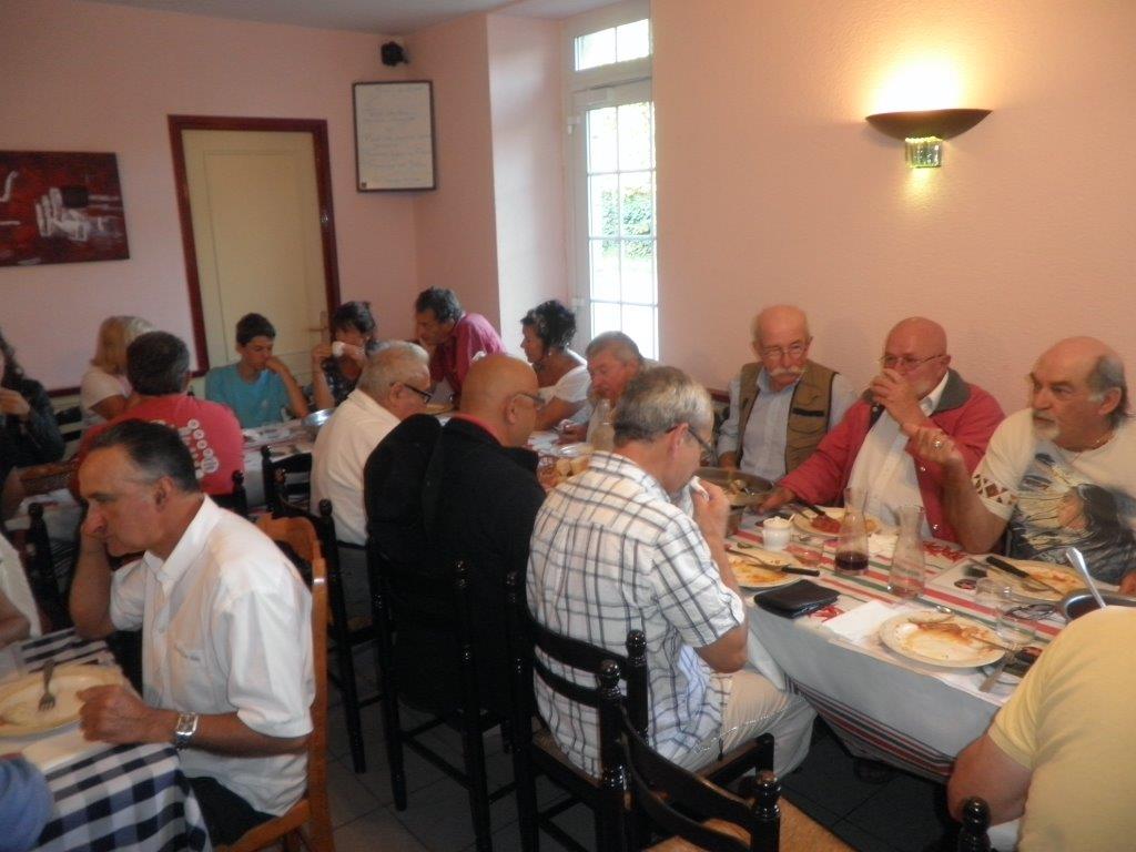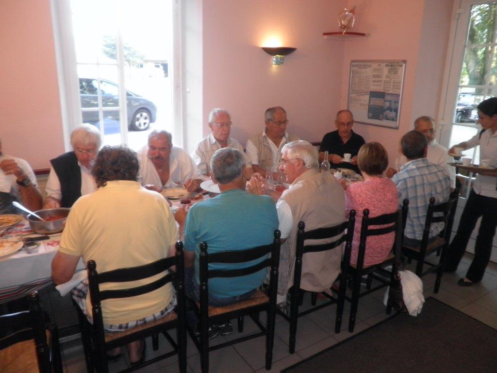 A 8h30 presque tout le monde était là, un beau groupe d’ancêtres ont pris la tête du peleton de 24 voitures, mais avant de partir, au restaurant l’Auberg’in, un petit déjeuner nous attendait avec au choix café, chocolat, thé, croissants pour les petites natures et un vrai petit déjeuner, piperade, ventrèche, oeuf, rosé, rouge, un régal pour nous mettre en forme et affronter les 60 km qui nous attendaient.
